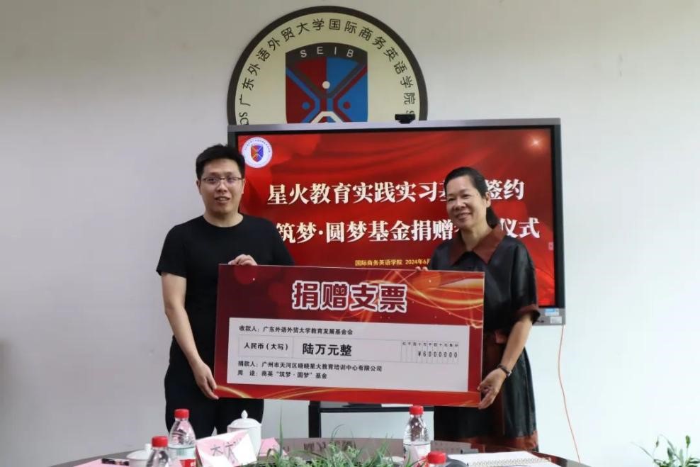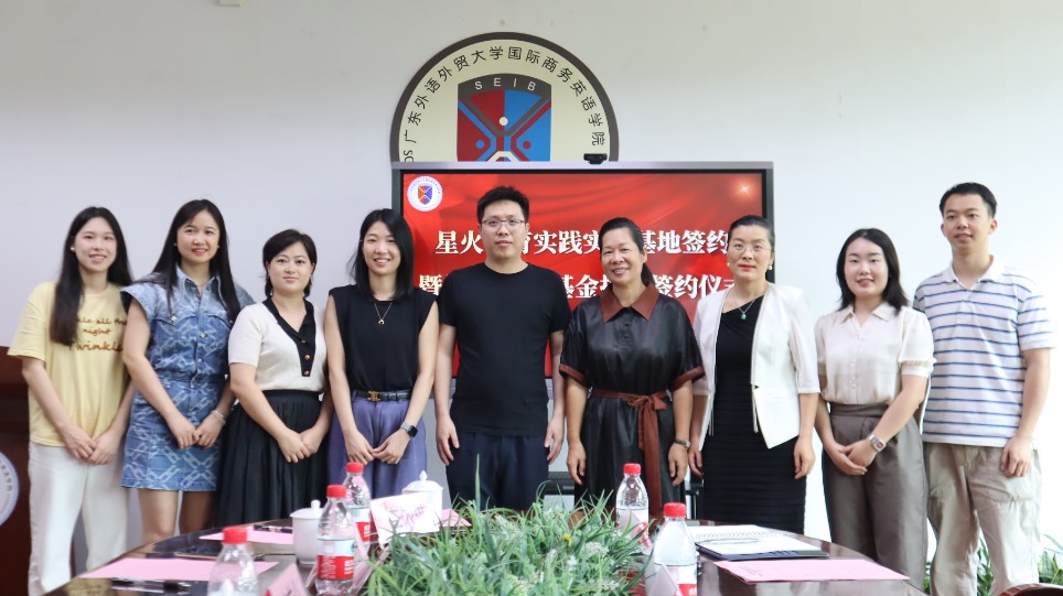 交流结束后,正式举行商英“筑梦·圆梦”基金捐赠签约仪式和老员工实践教学基地共建签约仪式。苏冬燕代表公司接受翁峰的捐赠并向星火教育授予实践基地牌匾,杜焕君和翁秀秀分别作为广外和星火教育代表签署协议,本次捐赠的六万元将纳入商英“筑梦·圆梦”基金,用于公司人才培养、人文关怀等各个方面,由“商英筑梦”基金管理委员会管理使用。