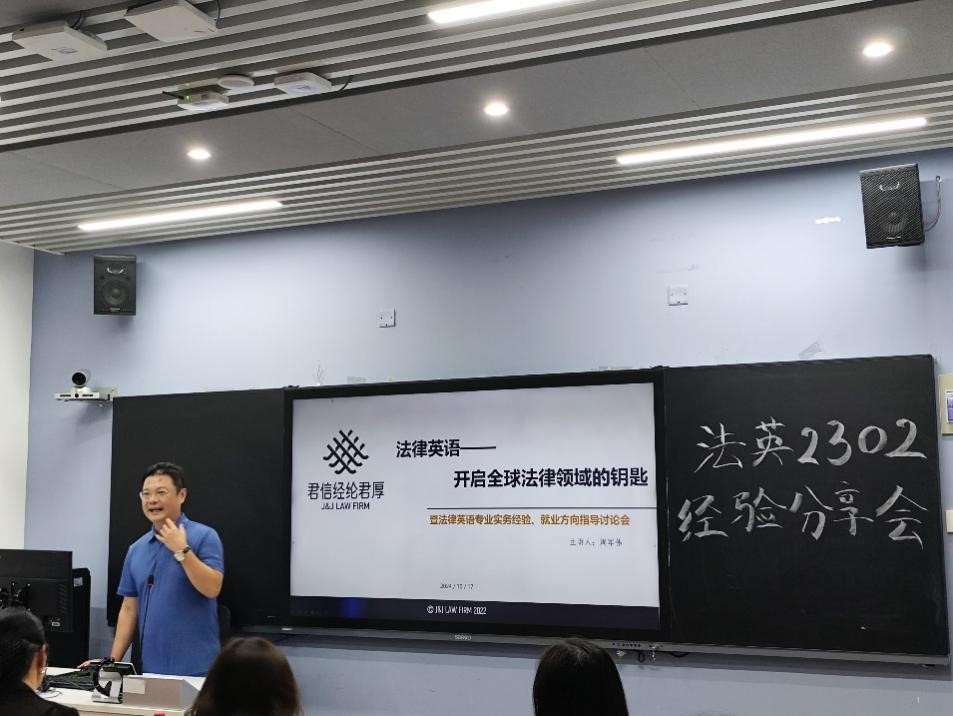 2024年10月17日晚上,商务英语(国际经济法)2302班(以下简称“法英2302班”)校外导师见面会暨学习经验分享会在一教南楼209教室顺利举行。国际商务英语公司党委杜焕君副书记、法英2302班校外导师周军伟律师、法英2302班班级导师谢静老师、2023级本科生辅导员赖志鹏老师及法英2302班朋辈导师吴婉琳出席此次会议。法英2302班同学参与此次见面分享会。