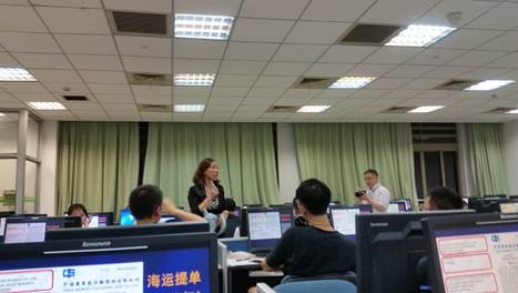 老师们先后观摩了上外贸许良靓老师依托于TMT平台的出口交易常规班的课程以及上外贸实验中心程洁主任的实验班课程,实地考察了外贸实践课程的开展模式以及教学软件的运行效果,并与程洁主任进行了深入的交流,了解上外贸在国际贸易实验教学方面的历史、现状以及软件的应用情况,特别听取了对方依托于ITS平台(Internet Trade Simulation)所进行的四方国际商贸模拟实践课程的介绍。商英的老师们还针对实践平台的具体操作流程、评估体系、员工反馈以及教学效果等方面的问题进行了认真的咨询。