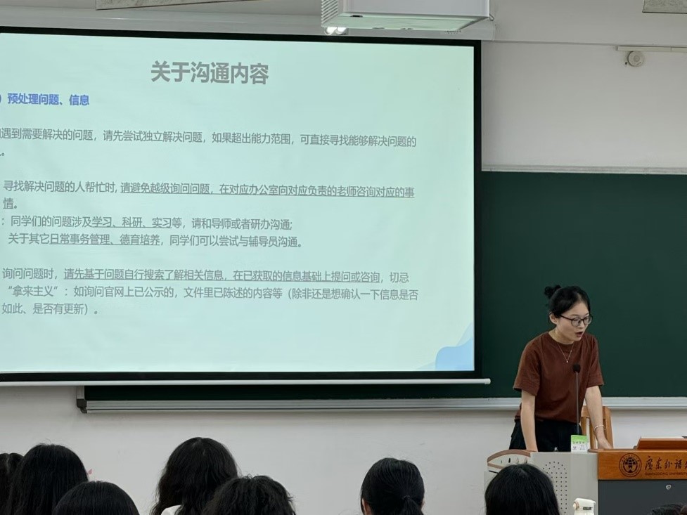 研究生办公室秘书黄锐老师就信息沟通规范做了详细说明,主要包括员工如何与研办沟通、广外邮箱使用说明、沟通礼仪、沟通内容等等方面,帮助员工更好地与公司老师做好有效沟通。