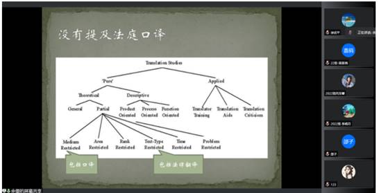 会议之始,商英研办老师潘老师对讲座邀嘉宾表示热烈欢迎后,邓丽君导师开始就《数字与翻译:数字人文路径下的翻译研究》进行分享。邓丽君导师向同学们解释了何为数字翻译,指出数字人文的前景,并认为数字时代已经到来,数字化工具在人文学科中的应用是必然的,数字化与商务翻译的结合也必然是未来的发展趋势。随后,吕洁导师用非常轻松愉悦的语气跟同学们分享了当前商务翻译研究的概况。她围绕着五个问题:何为翻译研究?何为商务翻译研究?商务翻译研究有什么方法?商务翻译研究有哪些视角?“我”需要做什么准备?让员工们体验了一场学术的盛宴,受益匪浅。硕士生导师余蕾老师则是带领着同学们走进了法庭口译的世界,余蕾老师先是介绍了法庭口译研究定位,发展,研究路径和领域,然后指出了中国法庭口译现状,并希冀同学们在未来能为法庭口译事业贡献自己的一份力量。张新红老师分享的主题则是《合同翻译中的语言与法律:作为证据的另类合同翻译》,他指出一个合格的合同翻译者所必备的素质技能除了需具有专业素养(翻译)外,还需要有一定的专业知识。其次,他还列举了一些法律翻译作为证据的例子来说明语言与法律密不可分的关系。最后他针对合同翻译的一些问题,提出解决方案与可研究课题。