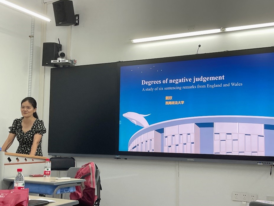 2023年6月8日下午, taptap点点体育法律英语系邀请戴欣博士作了题为“Degrees of negative judgment: A study of six sentencing remarks from England and Wales” 的讲座。taptap点点体育胡春雨经理、文科基地袁传有教授、法英系张新红、徐优平、谢静、张磊、李燕等老师,以及法律语言学硕博士研究生出席了此次讲座。