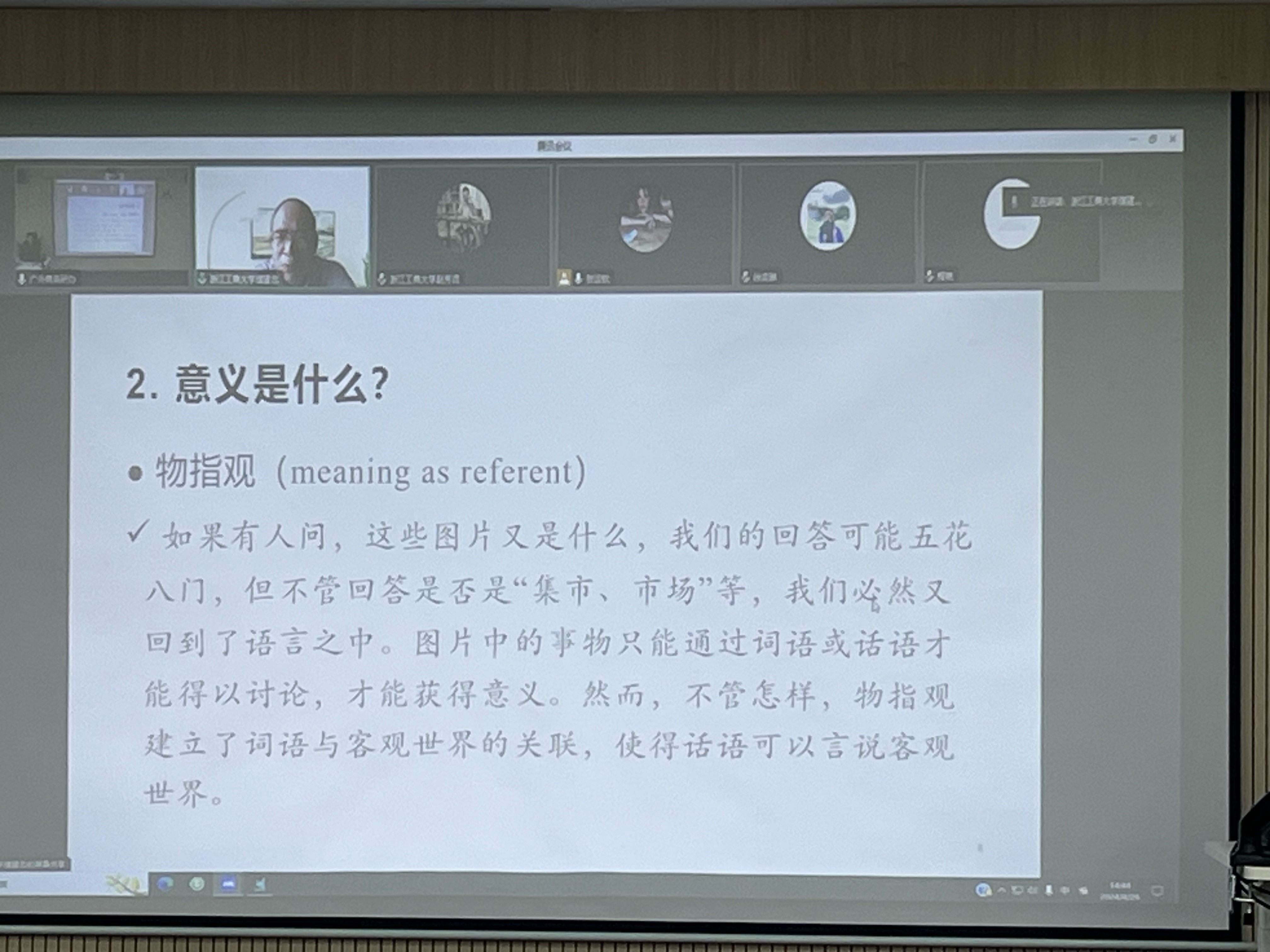 讲座伊始,濮教授从大语言模型的发展看到语言学理论研究的滞后,以著名语言学家Whorf的名言“Speech is the best show man puts on.”展开话题,并以“探寻‘market’的意义”为例,带领大家共同讨论“语言符号的意义是什么?哪里才能找到意义?怎样寻找意义?”,从而构建语料库语言学的意义理论。濮教授将意义理论分为指称论和使用论,将语言观分为系统观、语境观和话语观,再将意义观分为物指观、心指观、系统自指观、情景语境观、言语行为观、会话含义观、系统功能观、共文观和话语自指观,以幽默风趣语言,具体阐释了各类理论的核心观点。