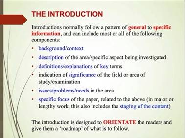 在第三和第四部份,Terry Royce教授围绕Introduction和Conclusions展开。首先,基于IMRD Structure,他从宏观角度上展示出Introduction和Conclusions在整篇文章中的位置和地位。接着,他联系具体的文本案例,分别介绍了这两个部分。对于Introduction,他向大家展示了Introduction的六大基本组成部份。对于Conclusion,他向大家展示了Conclusion的定义及功能。