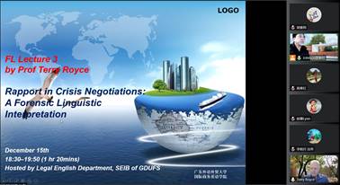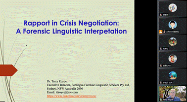 本次讲座就“法律语言学”为主题开展的系列云讲座中的第三讲,讲座题目为Rapport in Crisis Negotiations: A Forensic Linguistic Interpretation(危机谈判中的和谐关系:法律语言学的释解)。本次讲座主要分成三个部分进行:课堂知识回顾、重点理论讲解、课堂问答。