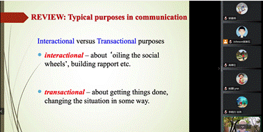首先Terry Royce教授对之前进行的前两讲的内容做了简要的回顾,主要包括话语交流的一般目的、口语语篇的本质、情态化和意态化、合作原则等内容。