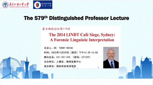 讲座伊始,刘平教授为此次云端会议作了开场致辞,对Terry Royce教授的学术分享表示热烈欢迎与感谢。随后,徐优平副教授向与会师生介绍了此次讲座的主讲人Terry Royce教授,重点介绍了Royce教授作为资深法律语言学家在法律实践领域的应用研究成果。随后,Royce教授为大家做了一场题为“2014年悉尼林德咖啡馆人质劫持事件的法律语言学阐释”的精彩讲座。