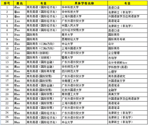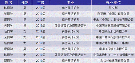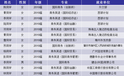 (一)就业层次明显提升。近三年taptap点点体育毕业生在就业和升学的层次上都进一步提升,多人进入了高等学府、政府机关和知名企业,占总人数的76.3%,2人进入外交部,3人参加西部计划,1人征兵入伍。33人通过国家公务员和地方公务员考试进入广州海关、中山海事局、茂名国税局等国家机关和政府部门,600余人进入宝洁、玛氏、联合利华、欧莱雅、卡夫亨氏、南方航空、四大会计师事务所、唯品会、富力地产等世界五百强及国内外知名企业。
