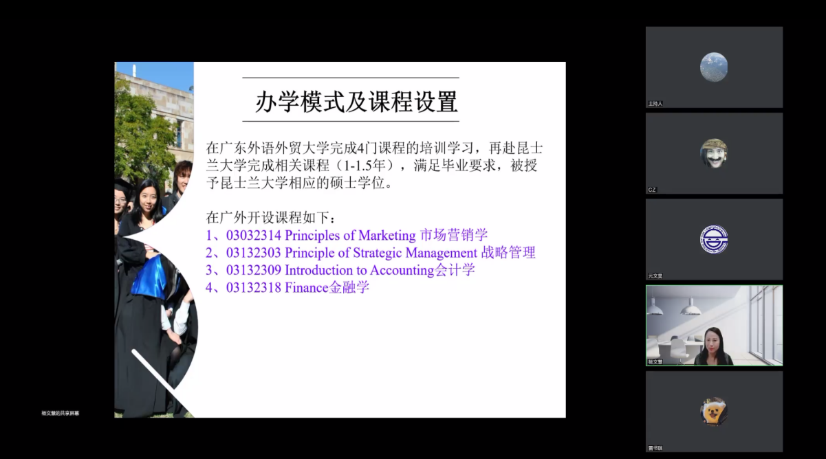 杨文慧副经理致欢迎辞,介绍了昆士兰大学、昆士兰大学商公司、项目办学情况及毕业生去向等,并详细解读了报名程序、入学要求、费用及语言要求等。