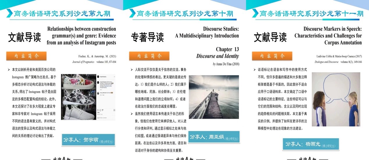 从本学期开始至今,公司顺利开展了三期商务话语研究系列学术沙龙活动,吸引了本校和外校师生亲临现场参与学习,并展开了积极热烈的学术讨论。公司贺宇萌、周亚娟、杨雨光三位博士生从不同的理论视角(如构式语法理论和身份理论)和不同的研究方法(如多模态方法论和语料库方法论)探讨了不同的研究主题(如Instagram帖子中的营销策略,话语与身份,话语标记语),不仅体现了商务话语研究系列学术沙龙活动多维度,多视角,多层面的特点,也展示了商英师生大力推动商务话语研究的创新发展的风采。