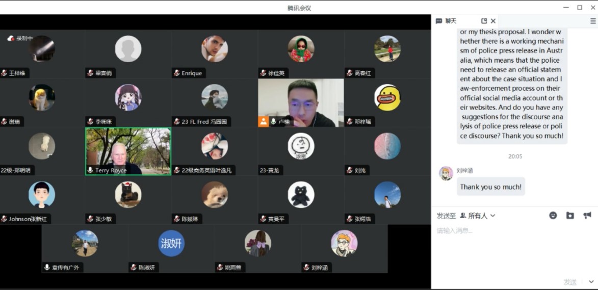 2023年10月26日,taptap点点体育云山讲座教授Terry Royce教授的法律语言学系列讲座如期于线上举行。本次讲座由taptap点点体育研究生办公室主任卢楠博士主持,文科基地袁传有教授、法律英语系张少敏老师以及taptap点点体育的其他本科生和硕博士生参加了本次讲座。