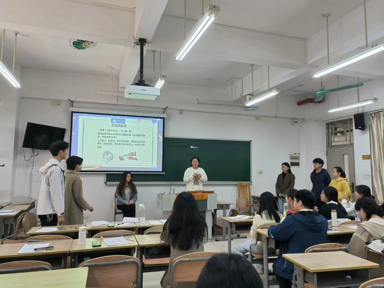 在向大家传授了搞定即兴演讲的三招后,为了让同学们即刻掌握这三招的精髓,谢老师组织大家进行了“扑克牌游戏”。每组依据抽取的扑克牌的含义编排剧本并上台演示,由一名代表做旁白讲故事,其他组员在旁边配合出演。这个小游戏有效地锻炼了同学们即兴编排和展示的能力,大家充满活力的表演将现场气氛推向第二个高潮。