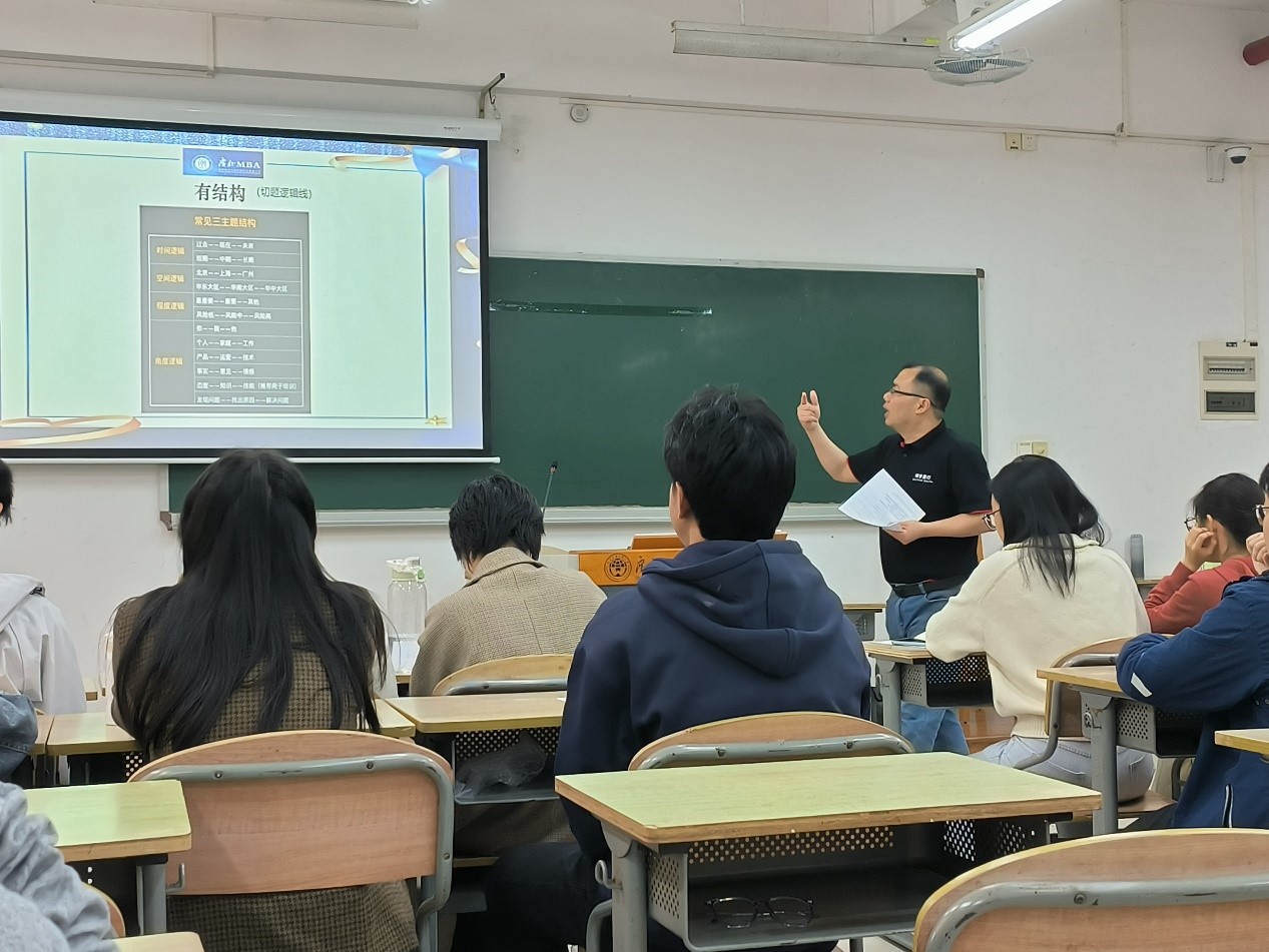 2024年1月8日上午9点,活动在六教B202如期开展。首先,公司国际商务系主任康蕾老师简短致辞并为同学们介绍了主讲人。接下来,谢泉江老师开始了本次精彩的讲座。本次学习的主要内容分为为什么要学即兴演讲、自我评估、三招搞定即兴演讲、演讲前准备以及最后的实战部分。谢老师巧妙的三招可以总结为:有结构——切题逻辑线、变简洁——专注讲重点、慢下来——享受时间。同学们在讲座中收获颇多,也为之后的实战打好了基础。