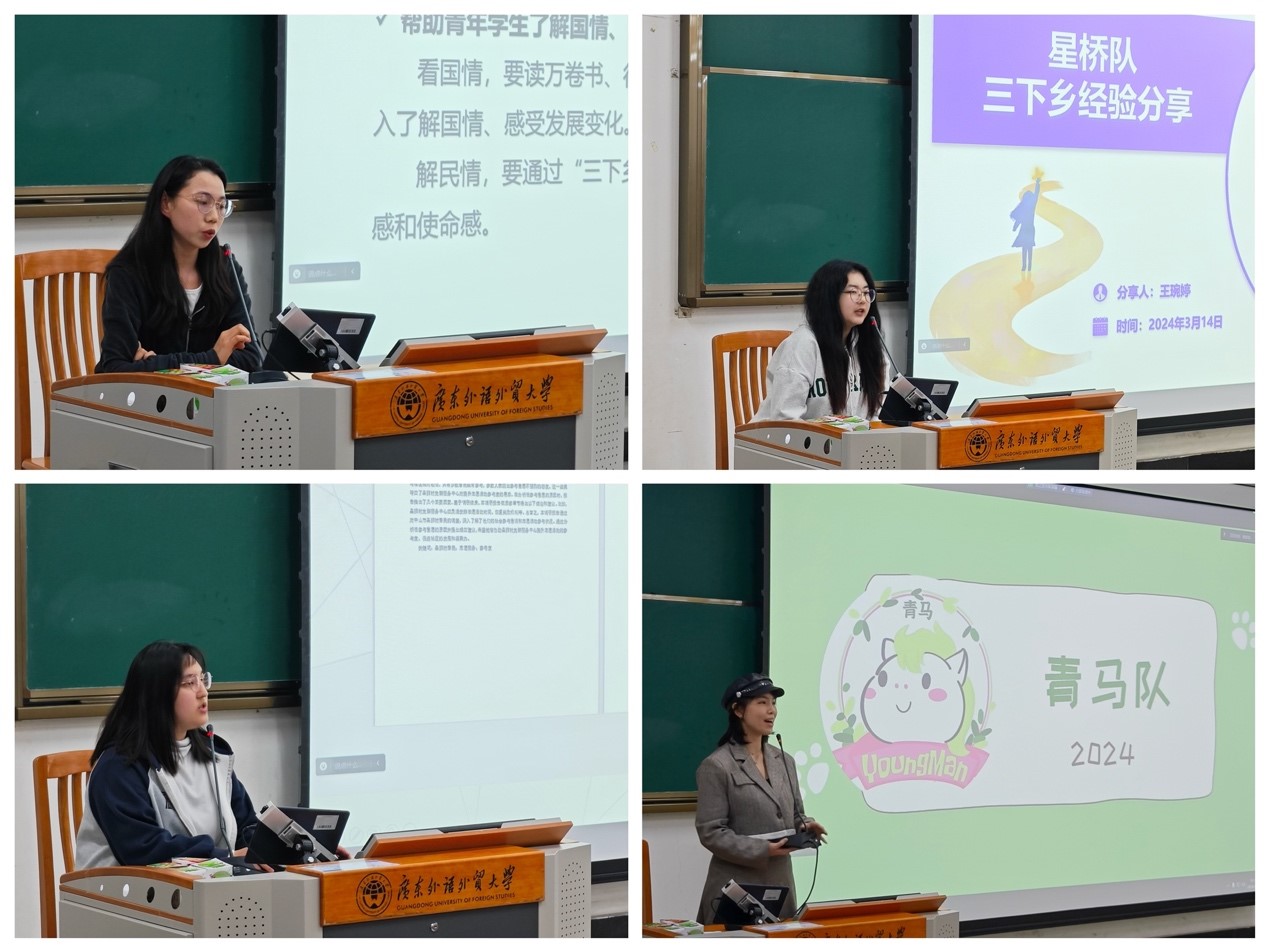雷欧队,青马队,星桥队三支公司优秀队伍通过对“三下乡”实践经历和美好回忆的生动讲述,让同学们进一步了解到了丰富多彩的“三下乡”社会实践活动,三支优秀队伍的总结给同学们带来了很多实用的经验,并更近一步加深同学们对参与“三下乡”实践活动的兴趣。