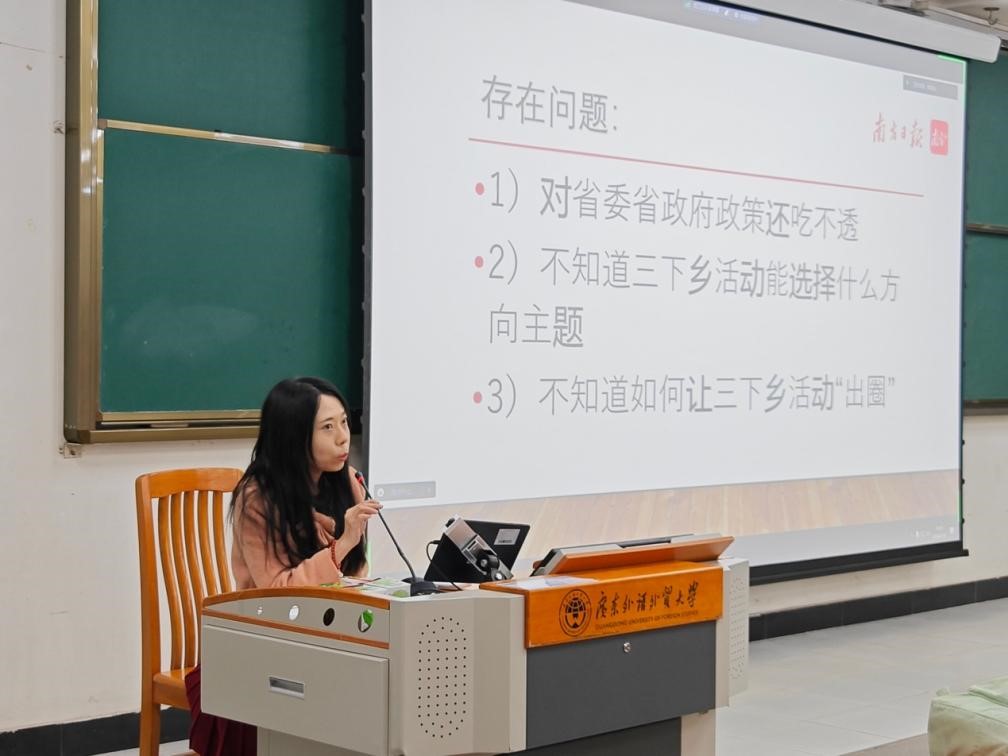 随后,就职于南方日报的沈丛升学姐对同学们在往年“三下乡”社会实践活动中取得的丰硕成果表示充分肯定,并就如何将“三下乡”社会实践活动贴近广东省“百千万工程”进行政策解读。通过对往年优秀实践案例的剖析,对同学们提了三点建议:一是要提高政治站位;二是要多形式开展活动;三是要寻找突破“出圈”。她鼓励同学们积极参与到“三下乡”社会实践中来,希望同学们能在社会实践中找到自己的社会价值并从帮助他人的过程中汲取能量。