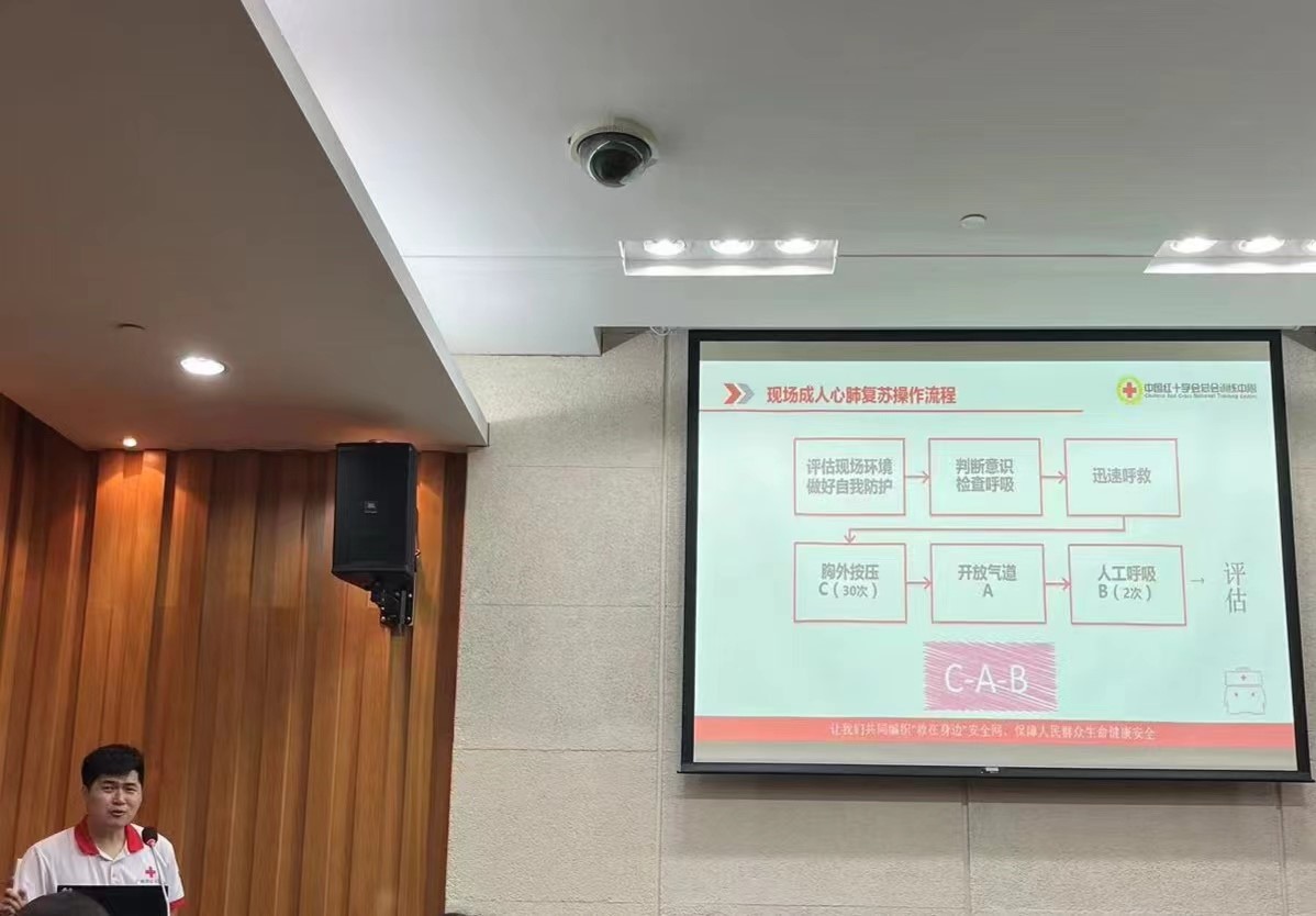 培训大会伊始,刘鹏程介绍了中国红十字会“三救三献”的主要工作以及红十字会纪念日的由来,并开展了救护概论专题培训。详细讲解了“保证安全”“防止感染”“及时合理救护”“心理支持”“救护现场协作”五大救护原则以及四大救护程序,并对心肺复苏(CPR)的相关理论知识进行培训。帮助志愿者们了解了心肺复苏的救援链、适用对象以及最重要的C-A-B的现场成人心肺复苏操作流程。