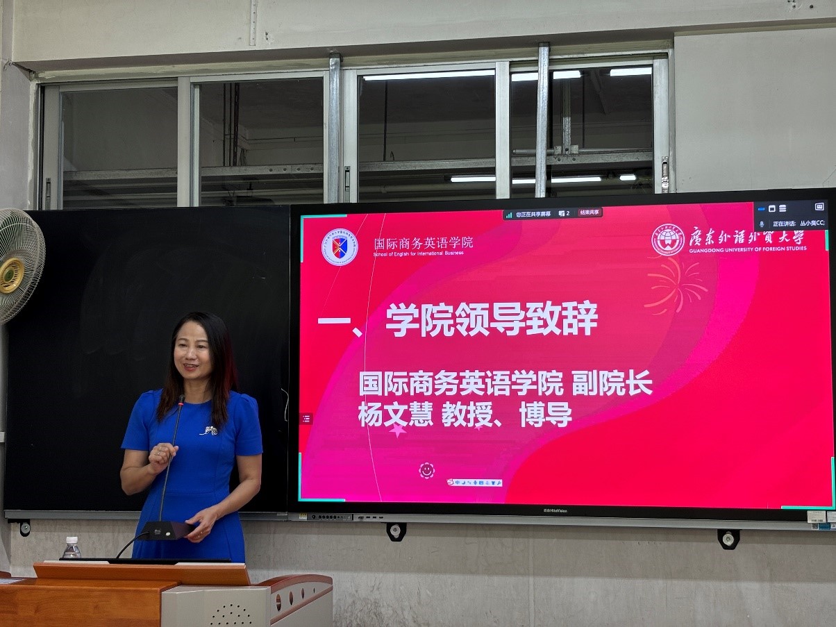 杨文慧副经理致欢迎辞,向新一期昆士兰硕士班新生的到来表示热烈的欢迎,向给予公司支持和信任的家长表示真挚的感谢。她介绍了广外-昆士兰大学硕士项目办学历史和昆士兰大学所在地布里斯班概况,强调了英语学习的重要性,希望同学们注重培养口语和写作等英语能力。同时,杨经理还提醒同学们平衡好专业课和语言学习,结合个人实际、尽早明确目标、开展职业规划,以顺利完成学业、出国留学。