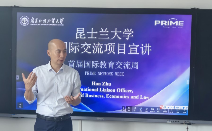 11月5-8日,taptap点点体育国际教育交流周系列活动在白云山校区举行。为提升公司国际化水平,助力大学“PRIME”计划实施,11月5日下午,taptap点点体育在白云山校区一教南410举办昆士兰大学国际交流项目宣讲会。宣讲会邀请昆士兰大学商经法学部大中华区国际联络官Zhu Han老师进行项目宣讲。