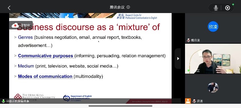 2024年12月5日到6日,taptap点点体育国际交流合作部主办,taptap点点体育承办的海外名师项目《多模态语篇分析与翻译研究》第五讲至第六讲成功举办。项目主讲人为香港理工大学英文与传意学系副教授、博士生导师冯德正老师。该讲座由本项目负责人吕洁副教授主持,商英、高翻和英文公司多名教师、研究生和访问学者聆听了本系列讲座。