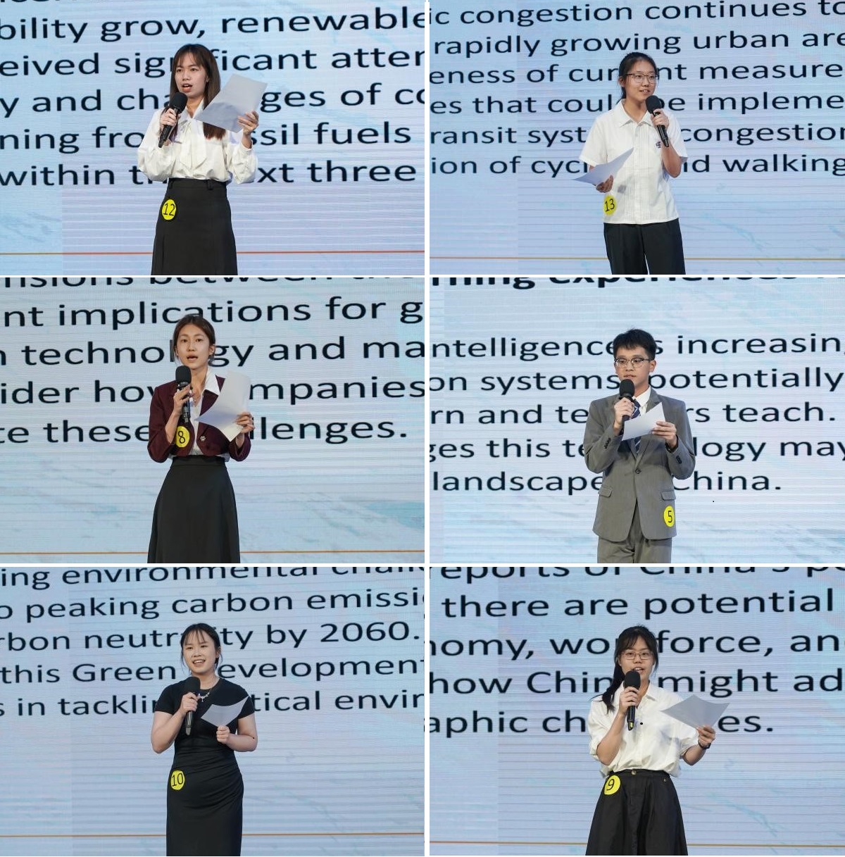 本届大赛采取“即兴演讲+主题演讲”双赛制;即兴环节由13位选手随机抽取“AI赋能教育”“可再生能源能否替代化石燃料”等兼具思辨性与时代性的题目,4分钟备稿后进行3分钟脱稿演讲及1分钟评委问答。选手结合语言学习趋势、传统文化出海等案例,从容回应评委的提问,展现临场应变与思辨能力,充分彰显了广外学子卓越的英语语言组织与表达能力以及临危不乱、灵活应变的综合素质。