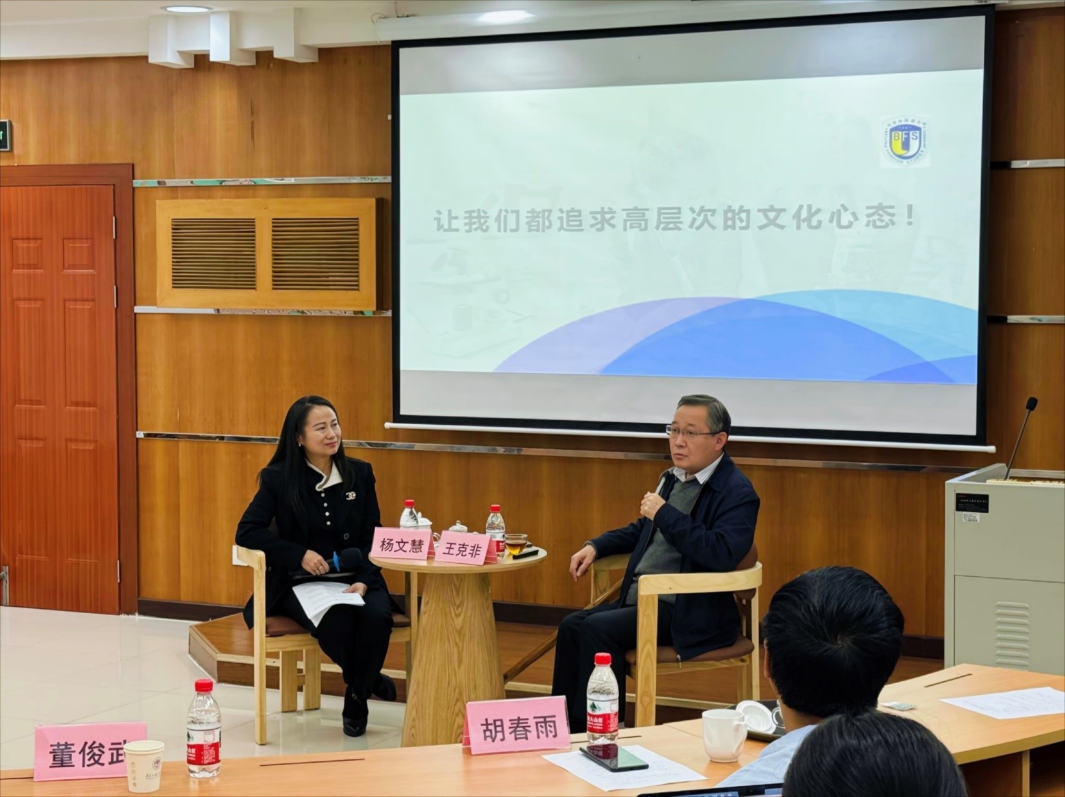 在随后的访谈环节,杨文慧教授与王克非教授围绕外语学科发展、青年教师培养以及学术期刊建设等话题展开深入交流。王教授指出严谨的学术传统和制度保障是推动学科进步的关键。他寄语青年学子与教师,在人工智能与全球化并行的时代,应不断拓展文化视野,增强学术底蕴,以“求索”精神面对未来挑战。