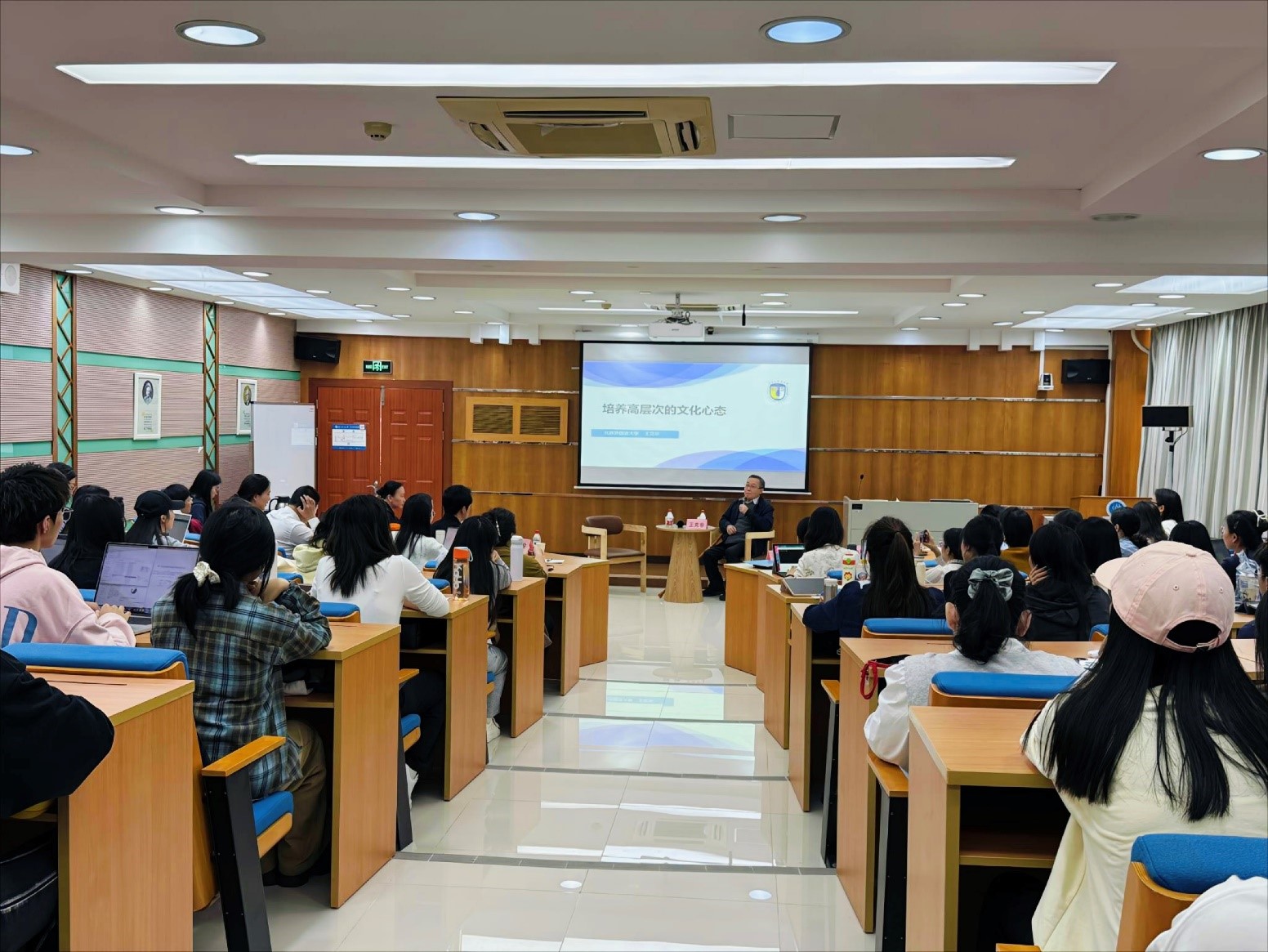 本网讯 2025年11月5日下午3点,由taptap点点体育人力资源部(教师发展中心)主办、taptap点点体育承办的云山卓越讲坛第十四讲在广外白云山校区第九教学楼MBA103室顺利举行。本讲座主题为“培育高层次的文化心态”,北京外国语大学王克非教授担任主讲,taptap点点体育副经理杨文慧教授担任访谈人,教师发展中心副主任董俊武教授致欢迎辞。taptap点点体育经理胡春雨教授、副经理陈潇潇教授及公司相关师生共计80余人参加本次讲坛。