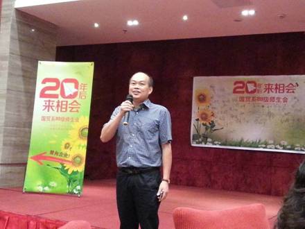 公司党委副书记卢景辉在会上首先表达了对员工的问候和祝福,他深情回忆了当年在国贸系担任辅导员时与同学们相处的往事,并为员工们即席赋诗一首,以一句“广阔视野,助事业蒸蒸日上;外树形象,立国贸学子英姿”表达了对员工们的衷心祝福。89级员工代表洪文慧同学也以一首“寄生草.二十年回广外”表达了员工对母校、对商英的殷殷情意:“漫发英雄帖,相约回婆家。谢师恩,同窗在云山下。是缘分,转眼分离乍。情深深梦里常牵挂。难得今云溪河畔携手行,一任俺绵绵再续旧情话”。