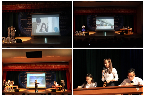 相比于图片新闻评述环节的严肃和紧张,配音环节则将大赛转换为幽默风趣的模式。本次配音环节截取了电影《致青春》、《重返20岁》、《后会无期》等热门电影的片段,通过让选手们根据人物动作表情灵活变换情境和台词的方式展示了选手们足智多谋、灵活变通的一面。其中,“Dazzle”队别出心裁地将商英学子做不完的Presentation,练不完的听力练习等学习日常片段穿插到电影情节中去,赢得观众阵阵掌声。