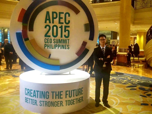 李佳宸,亚太青年模拟APEC大会——Model APEC全国四强,2015年11月作为中国青年代表参加了在菲律宾马尼拉举行的2015 APEC工商领导人峰会及其相关活动。12月23日,广外商英团学新闻部采访了李佳宸,同他畅谈了他此次从Model APEC 到Real APEC的经历。