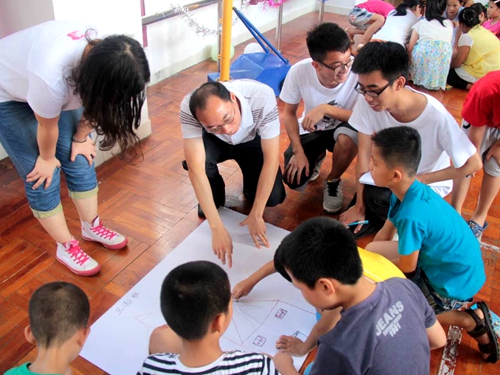 郭经理慰问“三下乡”队伍并指导小朋友做手工