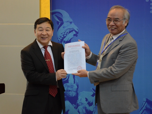 图三:罗选民教授向杜金榜教授转交决议