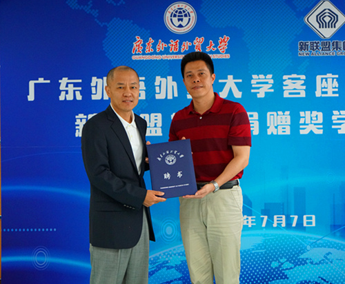 7月7日下午,广州新联盟投资集团有限公司向公司捐赠奖学金仪式在九教305举行,人事处副处长陈兵为受聘为公司客座教授的新联盟集团董事长李立新颁发聘书。新联盟集团总裁办主任马扶广、公司党委王秀民书记、副经理彭玲玲等参加仪式。公司党委副书记张林茂主持仪式。