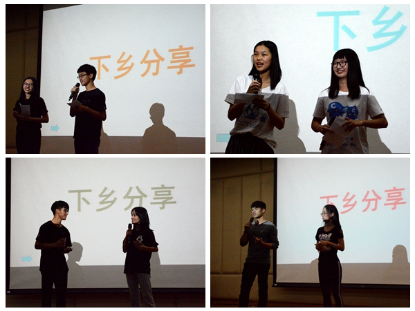 开场视频回顾了下乡期间的温情点滴,各支队伍也以话剧、舞剧等形式再现了“三下乡”期间的难忘。青马队轻松幽默的话剧表演,剧调动了全场的气氛,展示了青马队精神面貌,表达了对小朋友们的喜爱与想念。CCTeam与Leo队分别献出具有各自风格的歌舞剧表演,CCTeam在《我的未来式由我做主》的旋律下活跃欢快地展示了队伍的风貌以及与孩子们的点点滴滴。Leo队以温情满满的视频开场,用他们独特的歌舞剧表现他们与小朋友们宝贵的回忆。最后出场的小飞船队则用温馨的视频和话剧表演赢得了全场观众的欢呼和掌声。每支队伍的代表队员进行了下乡分享,向观众分享他们“三下乡”的体会和收获,或感慨和怀念团队一起做调研的坚持与努力,或感激“三下乡”带给自己的磨砺、成长和责任。