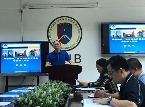 结合自身学习心得与工作体会,郭桂杭重点强调要以习近平新时代中国特色社会主义思想为指引,明确其对哲学社会科学教学科研发展工作的重要指导意义,要坚持党对教学工作的绝对领导;要在教学科研中自觉增强“四个意识”,做到“四个自信”;要进一步明确新时代、新格局对哲学社会科学教师提出的新要求,促进哲学社会科学教学研究实现内涵发展;要始终坚持立德树人,培根铸魂,扎根中国大地和中国特色,投身于中国特色哲学社会科学教学科研中去,以更加科学的哲学社会科学理论指导中国特色社会主义实践、解决中国发展问题,彰显哲学社会科学的中国特色、中国智慧、中国方案。