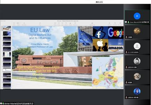 2022年7月1日下午3:30至5:30,taptap点点体育法律英语系组织举办了一场题为“The New EU Digital Markets Act and its Influences”的学术讲座,主讲人Anne-Marie Habib(安妮)为该系外教,她通过腾讯会议英文版VooV软件为法英系未外出实习的员工作了该系本学期实践周最后一场专业知识与技能分享。法英系教师张新红主任、谢静老师、徐优平老师、周亮老师、卢楠老师、邓朝霞老师等出席了今天的讲座。