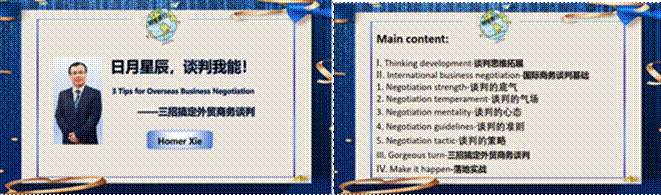 2023年1月2日与2023年1月3日,公司MBA员工、外贸实战培训讲师谢泉江先生与公司客座教授蔡斯老师受邀分别做题为“日月星辰,谈判我能—外贸商务谈判之理论&实践部分”“跨文化管理讲座-对文化变化的适应力”讲座与实践活动。