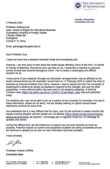 近日,公司收到澳洲合作院校领导发来的慰问邮件,昆士兰科技大学副董事长Scott Sheppard及昆士兰大学商公司副经理Andrew Griffiths就防疫抗疫期间海内外师生面临的生活和学习上的困难表达了问候之心和共度时艰之意。为确保正在进行的合作项目不受过多影响,尽量减少此次疫情影响之下海内外师生的生活和学习的不便之处,两校已通过官网、邮件、公众号等渠道为当前受疫情影响的员工提供了贴心的对策或建议,鼓励员工通过网络渠道进行信息登记,做好选课准备和网上学习等,相信在大家的共同努力之下,疫情结束之后定能早日恢复正常的学习生活。