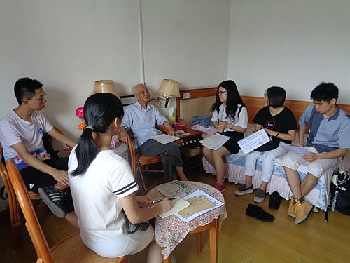 有一位叫郭魂的老人,我们亲切地称他爷爷,毫不吝啬地给我们讲述了他精彩的过往人生。他已95高龄,20岁开始教书,是一位中文老师,75岁才依依不舍地从岗位上退下,教龄足有50年。爷爷在讲述时眼里透着光芒,透露着无尽的自豪。爷爷还有着一手漂亮的毛笔字,他说,他从小就写毛笔字,从小就开始练,现在能写各种字,楷书、行书、隶书等等。他还说,练毛笔字不是一天两天就能练好的,它需要一个长久的过程。现在很多年轻人都打键盘、写圆珠笔,很少会写毛笔字了。爷爷不断叮嘱我们要练习写毛笔字,并且坚持下去。在座的各志愿者必是受益良多。