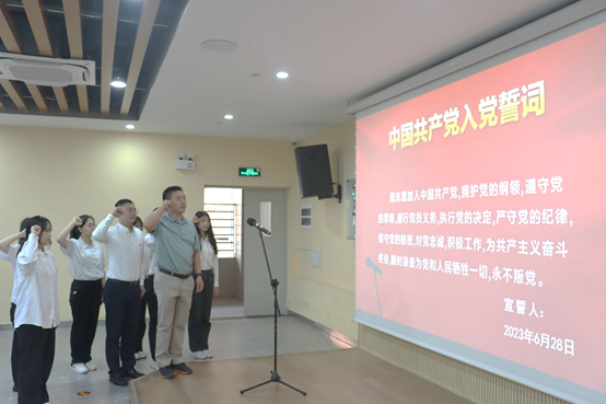 与会同志观看了公司主题教育工作纪实短片。公司党委委员、副经理汪谓超带领今年新发展的95位党员同志和全体教工党员面向党旗进行宣誓。在鲜红的党旗前,全体党员紧握右拳,铿锵有力、掷地有声的誓词再一次点燃了大家爱党、忠诚、担当、奉献的激情,坚定了广大党员助力公司高质量发展,勇担责任敢立新功的决心。