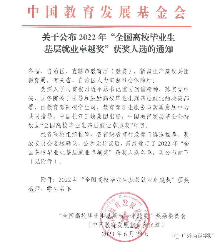 近日,教育部高校员工司公布了2022年“全国高校毕业生基层就业卓越奖”获奖人选名单,公司毕业生邵书琴荣获该项荣誉。