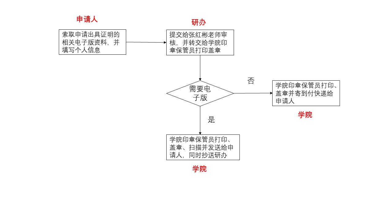4. 如申请人只需要电子版,印章保管员扫描证明信,并发送给员工本人,同时抄送研办张红彬老师;如申请人需要纸质版,印章保管员寄送快递给申请人,费用由申请人自理。