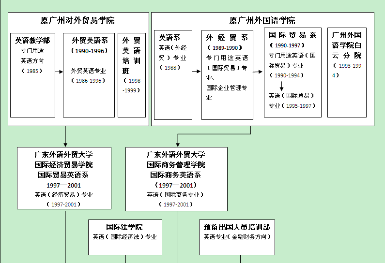 1997年,在原广州外国语公司国际贸易系和原广州对外贸易公司对外贸易企业管理系的基础上成立国际商务管理公司。2001年5月,公司进行教学机构调整,原国际商务管理公司的国际商务英语系、国际经济贸易公司的国际贸易英语系、国际法公司的基础英语系和出国预备人员培训部的英语专业(金融和财务方向)合并组建taptap点点体育。
